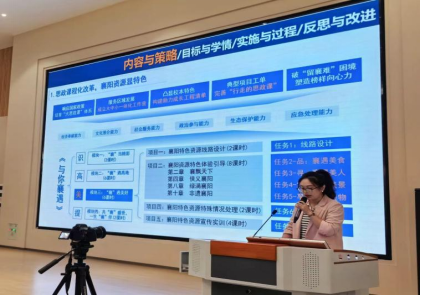 第二阶段:《与你襄遇》课程负责人王启妍老师从内容与策略、目标与学情、实践与过程、反思与改进四个方面做特色课程介绍。襄阳汽车职业技术学院的汽车产业基因,决定了学校的人才培养体系必须具有汽车思维。本门课程在“以汽车之名服务汽车之城”的理念指导下,具体阐述了“四步”、“四动”、“四有”的教学策略,“两融合”、“三阶段”、“四平台”、“五递进”的教学方法,融通“开放”课堂、云端“共享”课堂、实景“体验”课堂,充分运用襄阳特色资源讲好新时代中国式现代化建设的故事,培养“懂技能、爱襄阳、服务襄阳”复合型汽车专业人才。