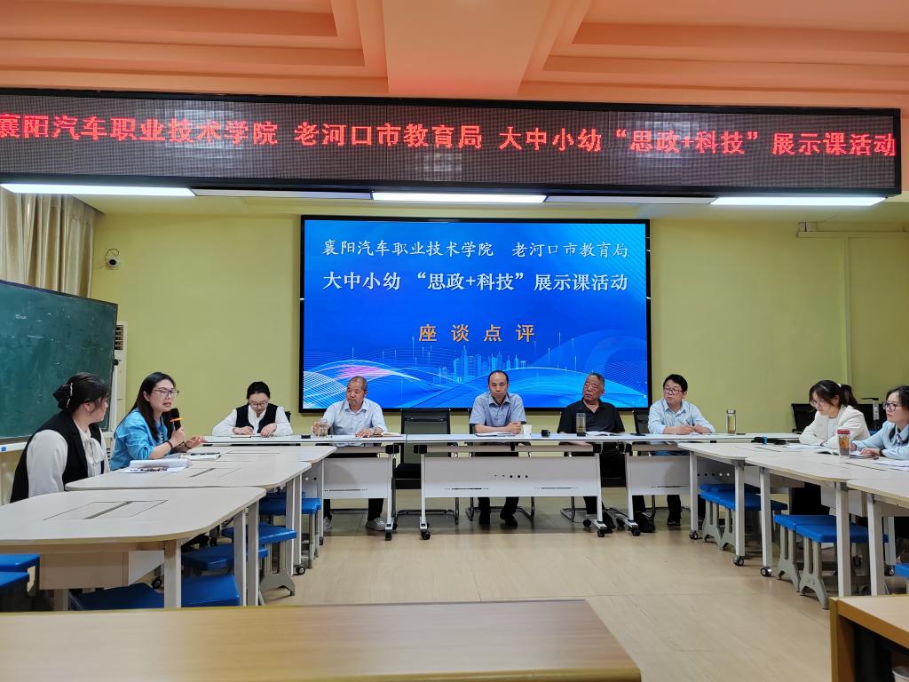 思政与科技同频共振。在座谈交流环节,五位授课教师以说课为媒,深度解构教学设计逻辑、回溯教学实践反思,让科技强国的时代脉搏化作各学段课堂的鲜活律动。老河口市教育局党组成员、副局长郝元朝、襄阳汽车职业技术学院马克思主义学院院长朱文以及大中小幼各阶段教师代表分别从顶层设计与实践落地双向维度,对“思政+科技”融合模式的前瞻性、创新性给予高度评价,并围绕深化校地资源共享机制、优化全学段课程衔接体系、各学段联合教研等核心议题,擘画了大中小学思政课一体化建设协同发展的进阶蓝图。