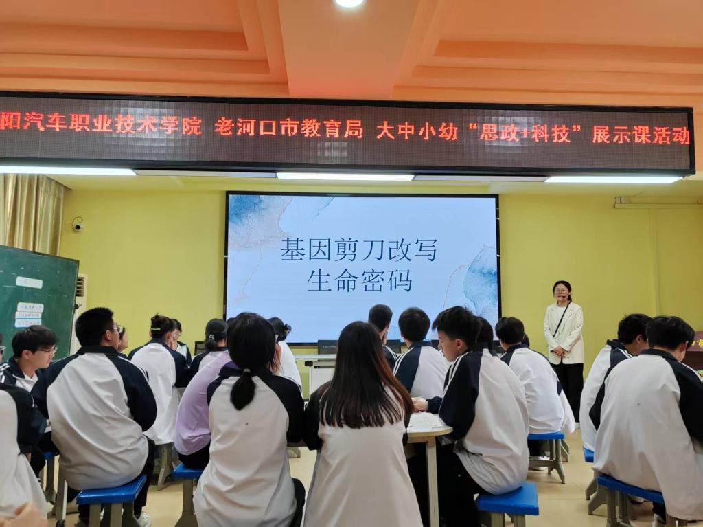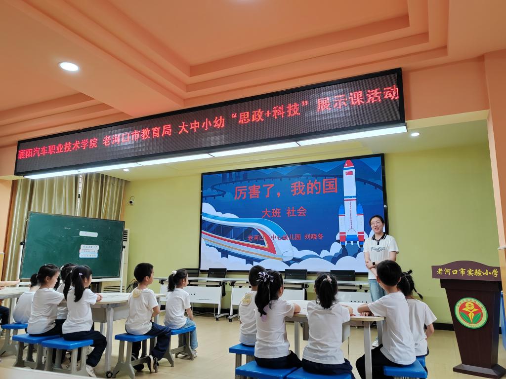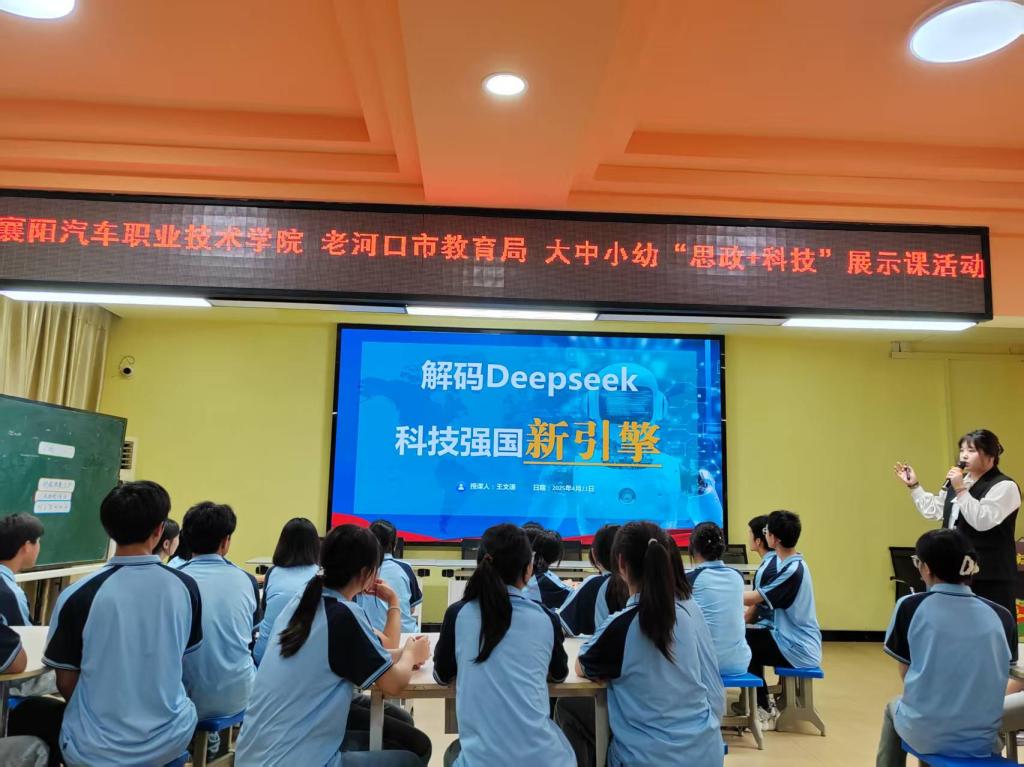 思政与科技深度融合。来自大中小幼五个学段的优秀教师同台共研,以科技为链、思政为核,呈现了一堂贯通式“思政+科技”展示课,串联起了从幼儿科技启蒙到高校创新实践的全链条育人新范式。老河口市中心幼儿园刘晓冬老师匠心展示《厉害了,我的国》主题课,以科技发展为叙事轴线,从绿皮车的时代记忆到高铁的贴地飞行,巧妙构建 “速度中国”的思政认知图谱,将硬核科技成就转化为可感知的爱国情怀培育载体,实现了“大国重器”与“童年梦想”的双向赋能;老河口市实验小学刘嫚老师的《科技改变生活,AI赋能未来》以“机器人马拉松”为认知锚点,以贴近生活的视角,引导学生深度探究人工智能对日常生活的重塑与革新,构建起思政与科技的对话桥梁;老河口市第四中学陈贤老师立足《科技创新,强国有我》,从触摸科技的温度、感知创新的尺度出发,引导学生树立正确的科技价值观,将个人理想融入科技报国的宏伟蓝图;老河口市高级中学杨心悦老师的《基因剪刀改写生命密码》以生命科学为棱镜,折射出科技与伦理的双螺旋光芒,在基因图谱上镌刻出新时代青年的道德坐标。襄阳汽车职业技术学院王文谦老师带来的《解码DeepSeek:科技强国新引擎》,将课堂化作大国博弈的微观战场,既揭示了科技突破背后的“举国体制密码”,更在育人土壤中埋下“做科技长征接棒人”的信念火种。五节课立足学段特征精准发力,又通过“科技报国”主线有机衔接,形成“启蒙-筑基-淬炼-领航”的梯度育人体系,为推进“大思政课”一体化建设提供创新实践样本。