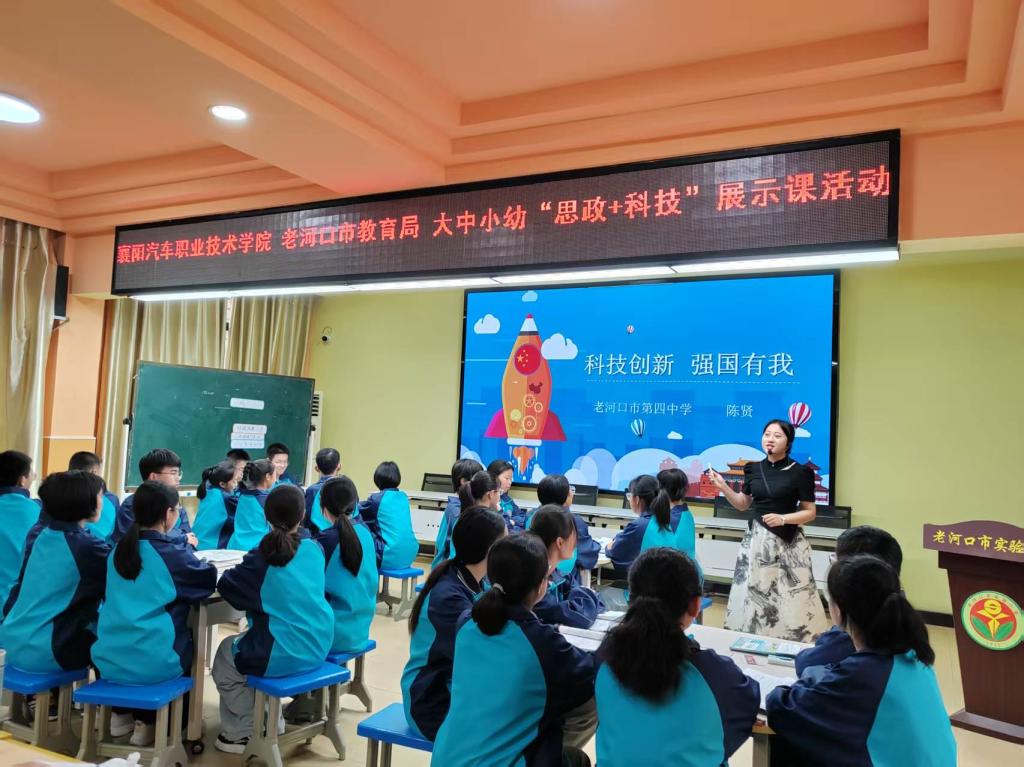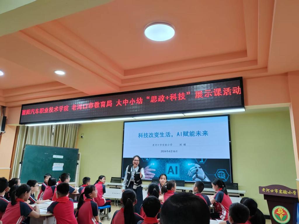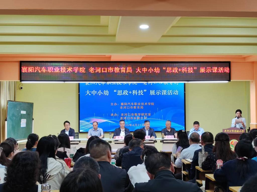为深入学习贯彻习近平总书记关于学校思政课建设的重要指示精神,持续推进大中小学思想政治教育一体化建设,把思政课讲“活” 、讲“透” 、讲“潮”,以科技动能激活思政教育新生态。4月21日,襄阳汽车职业技术学院携手老河口市教育局在老河口市实验小学开展大中小幼同上一堂“思政+科技”展示课活动。老河口市教育局党组书记、局长郝勇,党组成员、副局长郝元朝,襄阳职业技术学院马克思主义学院院长叶朝,襄阳汽车职业技术学院马克思主义学院院长朱文,老河口市区域教育研究发展中心主任魏永权,老河口市教育局教研室主任黄昌盛,老河口市实验小学党总支书记聂庆安及思政课教师代表等出席了本次活动,围绕“科技赋能·向新而行”主题,以校地协同之笔,共书五阶贯通育人长卷。