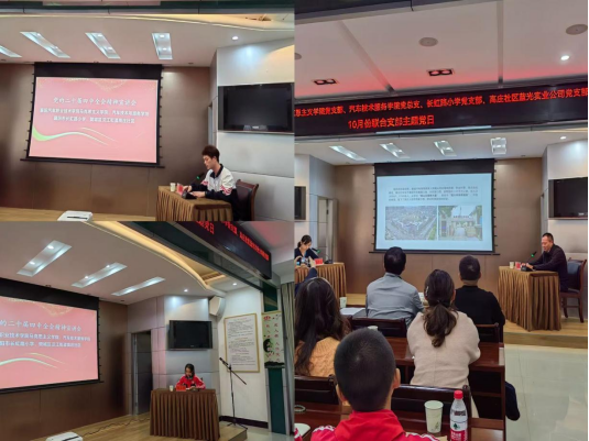 活动收官阶段,襄阳汽车职业技术学院马克思主义学院党支部、汽车技术服务学院党总支与高庄社区蓝光实业公司党支部、长虹路小学党支部联合开展主题党日活动。全体党员重温入党誓词,强化初心使命认知,围绕“党建引领、思政教育与社区发展深度融合”展开专题研讨,明确了校社协同育人的核心方向与实践路径,并达成三大长效共建共识:一是共建一体化思政实践教育矩阵。以高庄社区“全国文明单位”“基层立法联系点”等特色资源为依托,联合打造覆盖大中小学各学段的思政实践教育基地,开发“党建引领治理”“全过程人民民主实践”等特色实践课程,形成“课堂教学-实地研习-成果转化”的闭环教学体系,推动思政教育从校园走向社会、从理论走向实践。二是搭建产教融合协同发展平台。立足襄阳汽车职业技术学院专业优势与蓝光创新创业孵化园产业需求,建立“专业实践-企业需求-就业创业”精准对接机制,实现高校人才培养与社区产业发展的双向赋能、同频共振。三是组建跨域理论宣讲志愿服务队。整合高校师生党员、社区党员、企业党员力量,组建一支兼具理论深度与实践经验的跨主体宣讲队伍,通过“校园宣讲+社区分享+线上传播”等多元形式,推动党的创新理论在基层持续深耕、入脑入心。